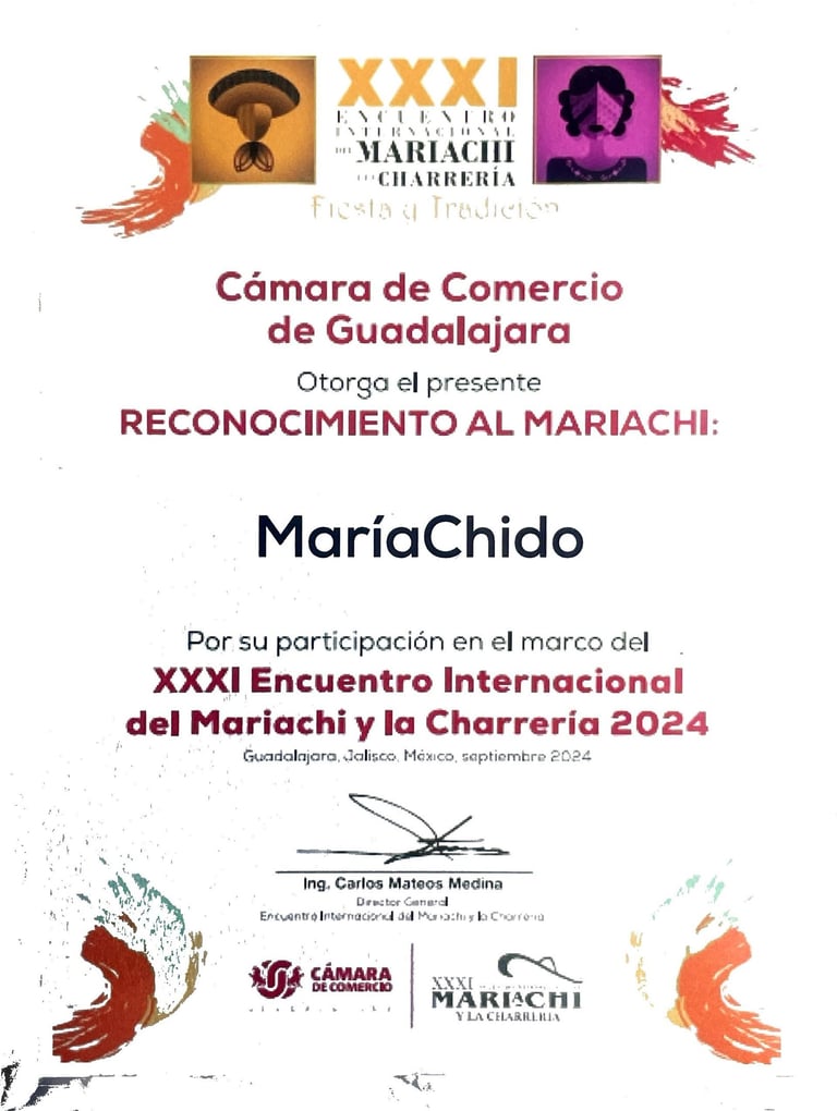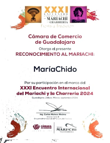 Recognition to Mariachido from "la Cámara de Comercio de Guadalajara"